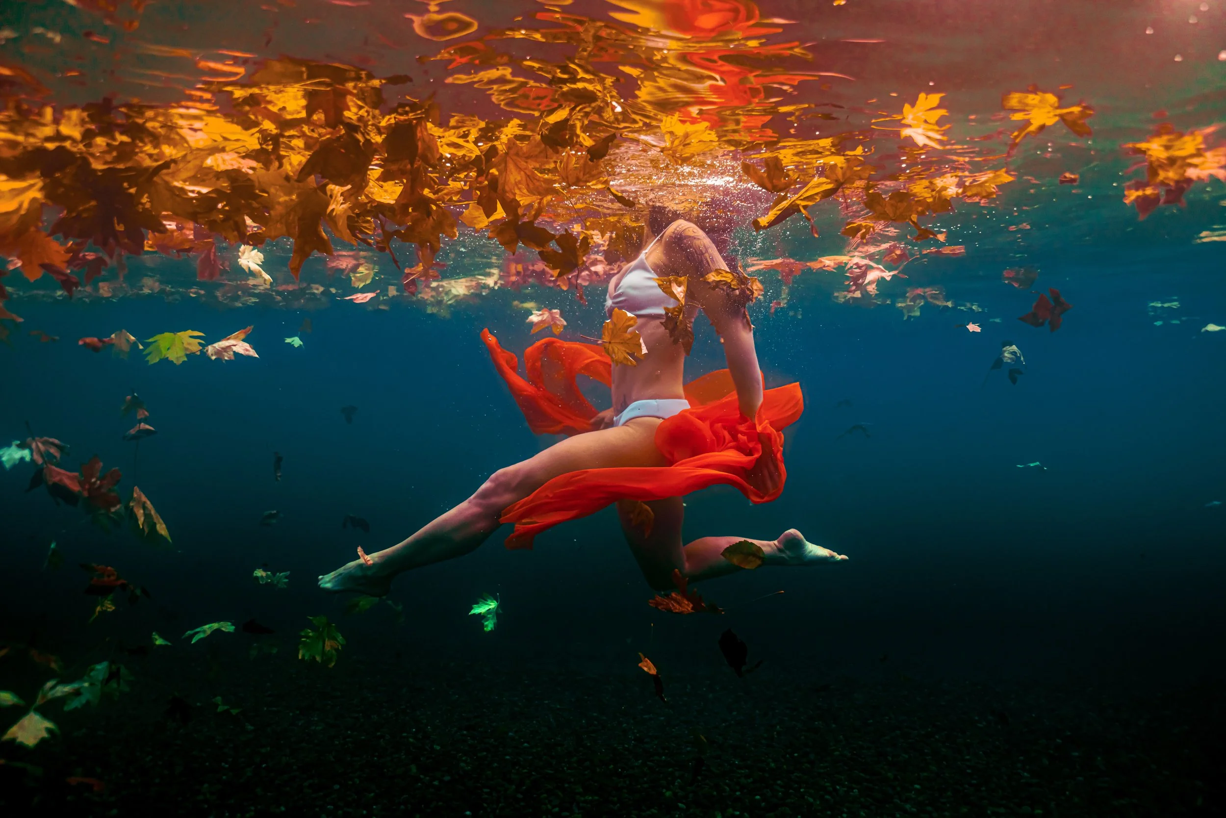 This year we started testing a few props. A dress. A sarong. A pile of golden/ yellow Fall leaves. This is where things start to get considerably more complicated. When introducing fabrics into the water, an element of risk elevates with it. The fabric is cumbersome, acts like a sail, an anchor, a straight jacket, a tourniquet….pick your problem. The more the fabric, the bigger the problems. Then add current. Staying untangled is a real thing.